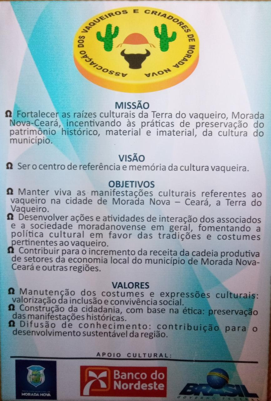 ASSOCIAÇÃO DOS VAQUEIROS E CRIADORES DE MORADA NOVA CEARÁ - AVCMN. CRIADA EM 1943 COM OBJETIVO DE PRESERVAR A CULTURA VAQUEIRA NO MUNICÍPIO DE MORADA NOVA - CE.TEM COMO MISSÃO FORTALECER AS RAÍZES CULTURAIS DA TERRA DO VAQUEIRO, INCENTIVANDO AS PRÁTICAS DE PRESERVAÇÃO DO PATRIMÔNIO HISTÓRICO, MATERIAL E IMATERIAL, DA CULTURA VAQUEIRA, COM VISÃO DE SER O CENTRO DE REFERÊNCIA E MEMÓRIA DESTA CULTURA PARA O DESENVOLVIMENTO CULTURAL, TURÍSTICO, ECONÔMICO E SOCIAL DO MUNICÍPIO.