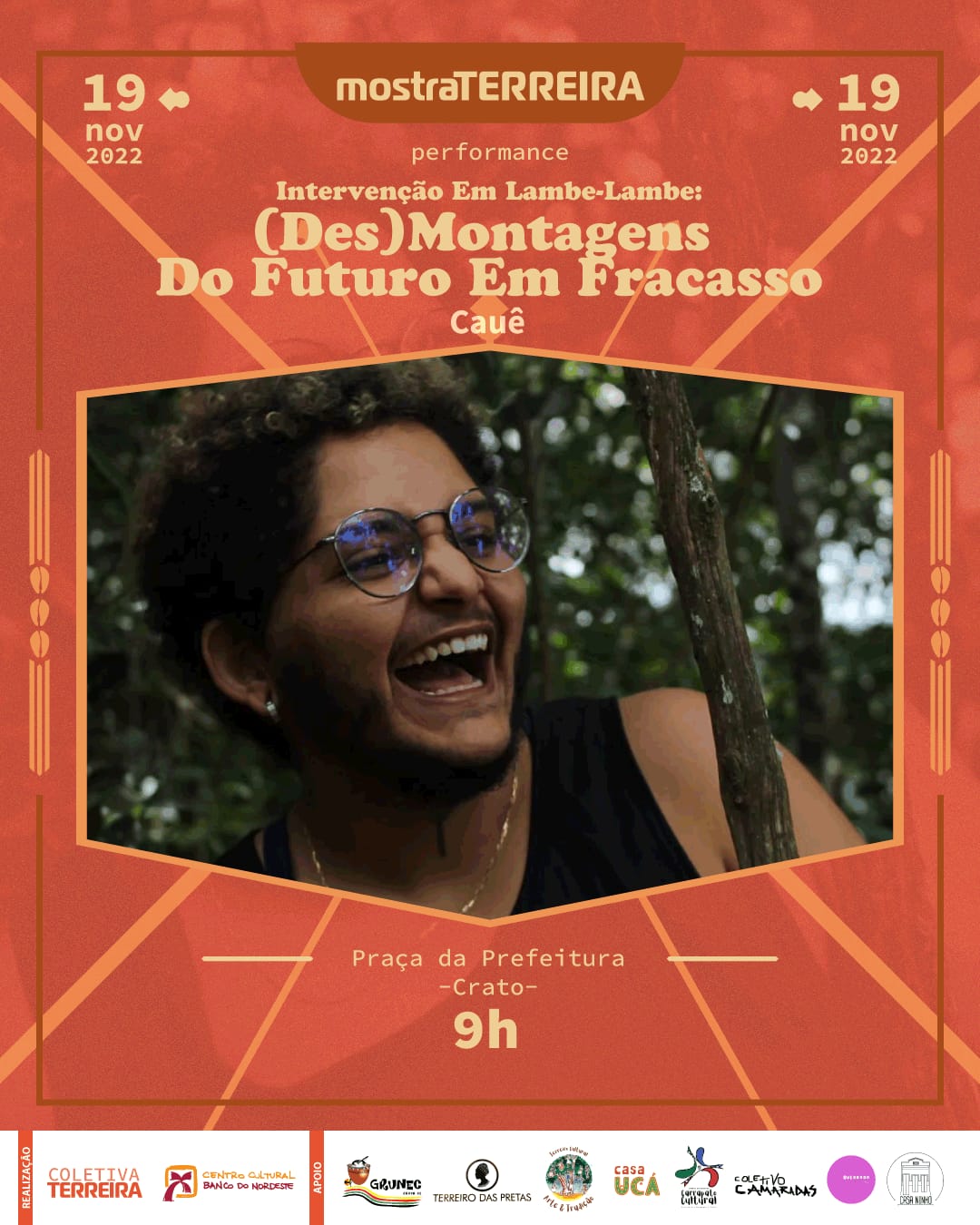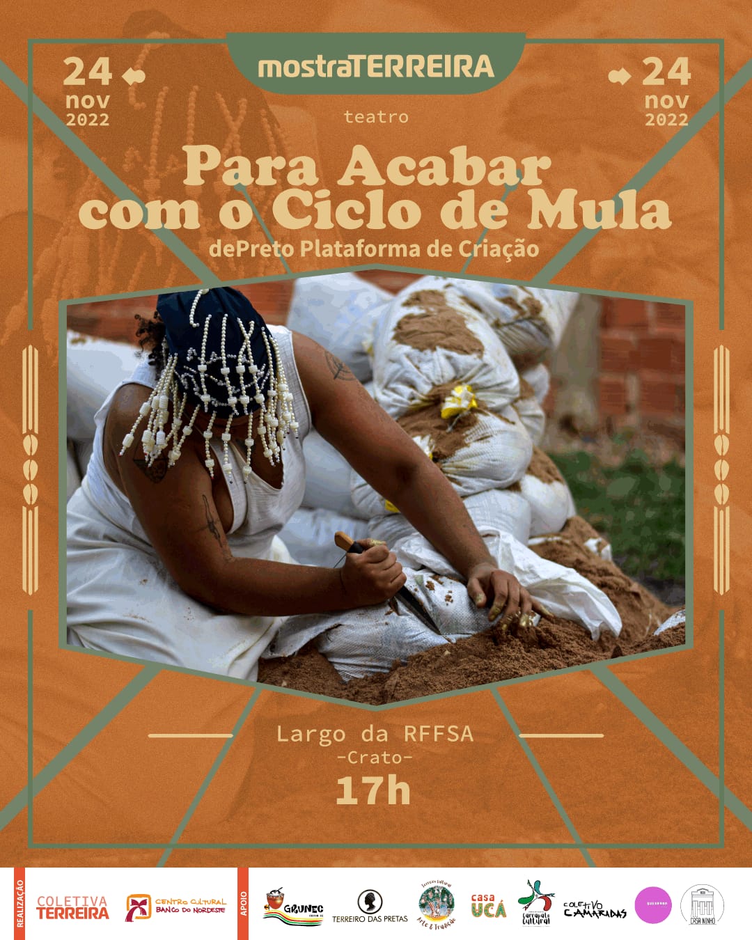Ajuntamento de artistas pretes do Cariri atuantes em múltiplas linguagens artísticas e áreas técnicas, articulando as tecnologias de criação em campo expandido, evocando as formas de produção de saberes de base ancestral, cotidianos e acadêmicos, construindo um movimento de aquilombamento que perspectiva pensar as artes em cruzamentos numa evocação exusiática de nossas práticas.