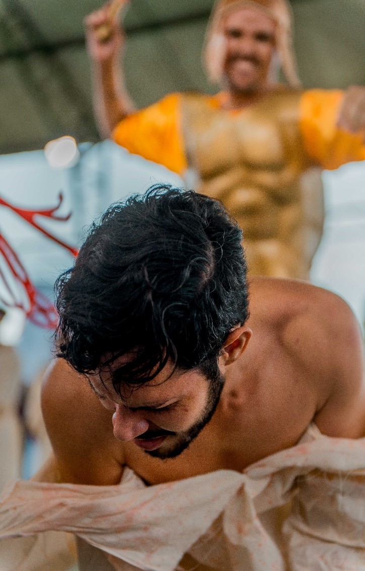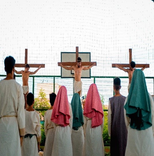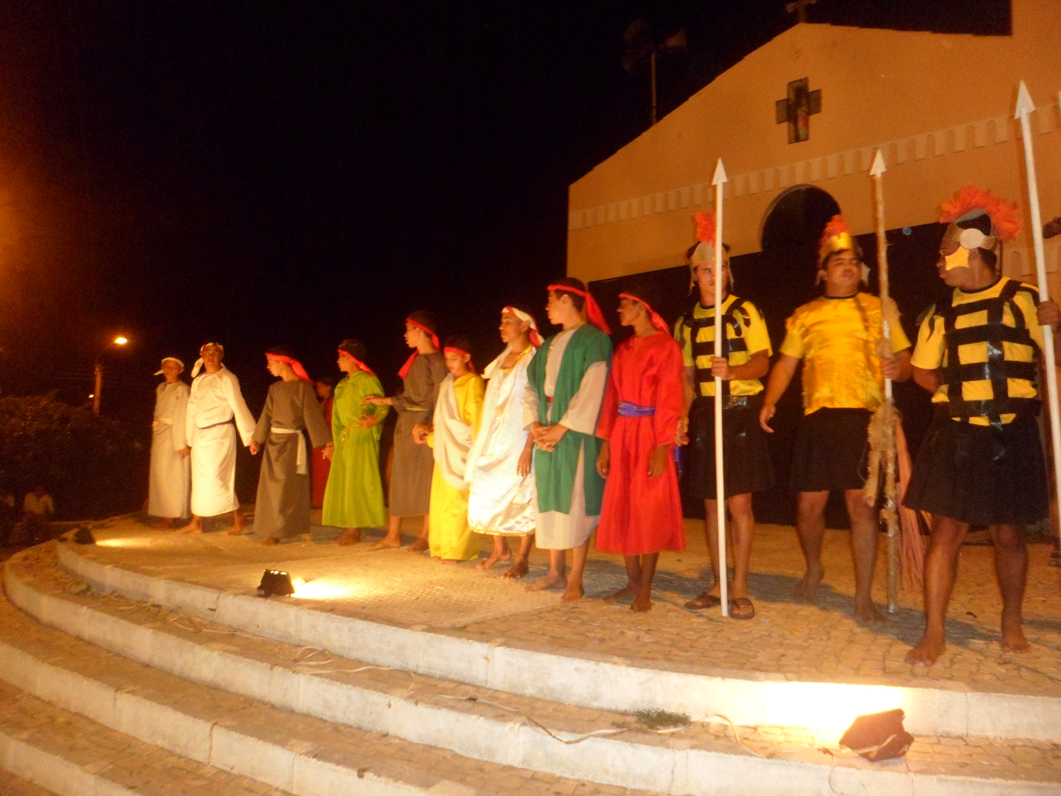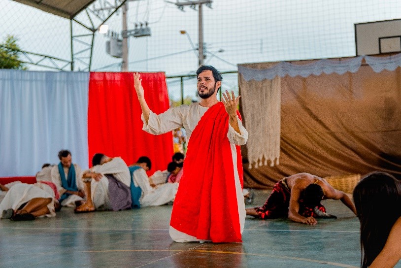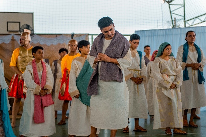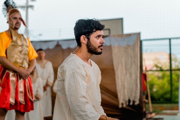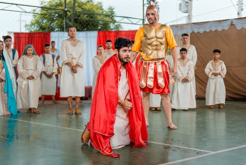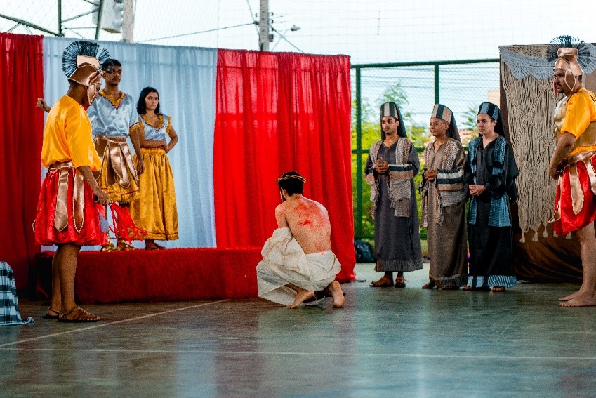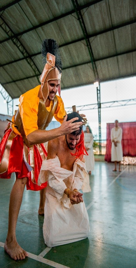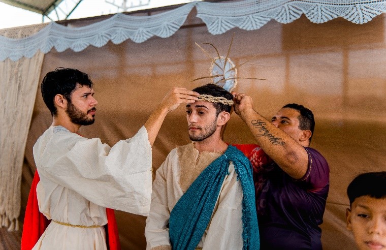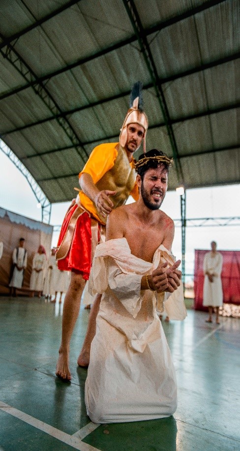 Esse diálogo de tradições resulta no espetáculo criativo na construção de suas cenas, personagens, trilha sonora, figurinos e adereços. Trabalho resultante da investigação intensiva de um grupo de artistas reunido pra promover junto a comunidade do Bairro Santa Luzia, em Canindé, mais um espaço para celebração da arte e da fé no período pascal.