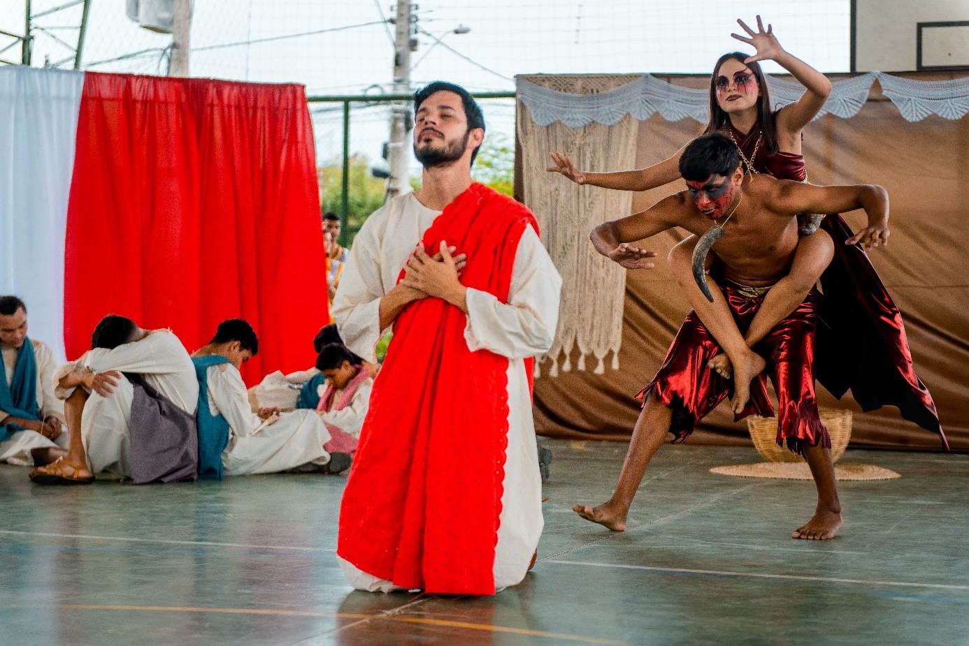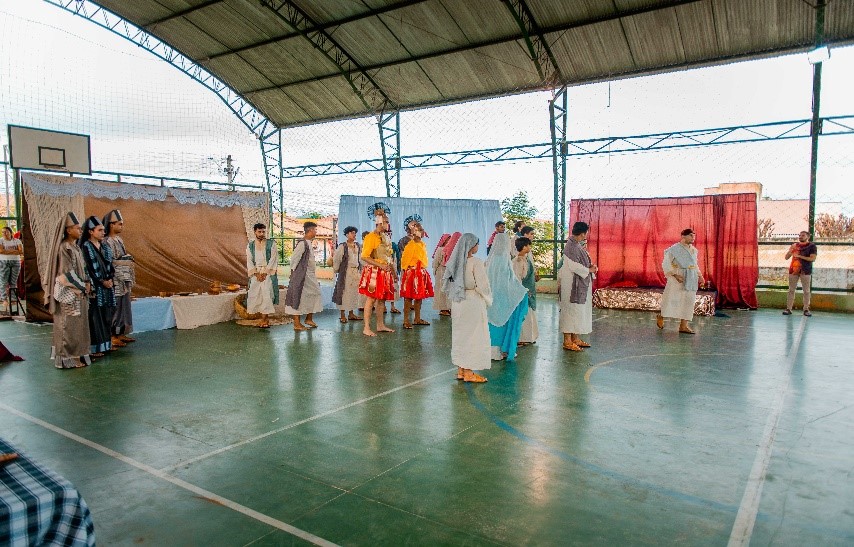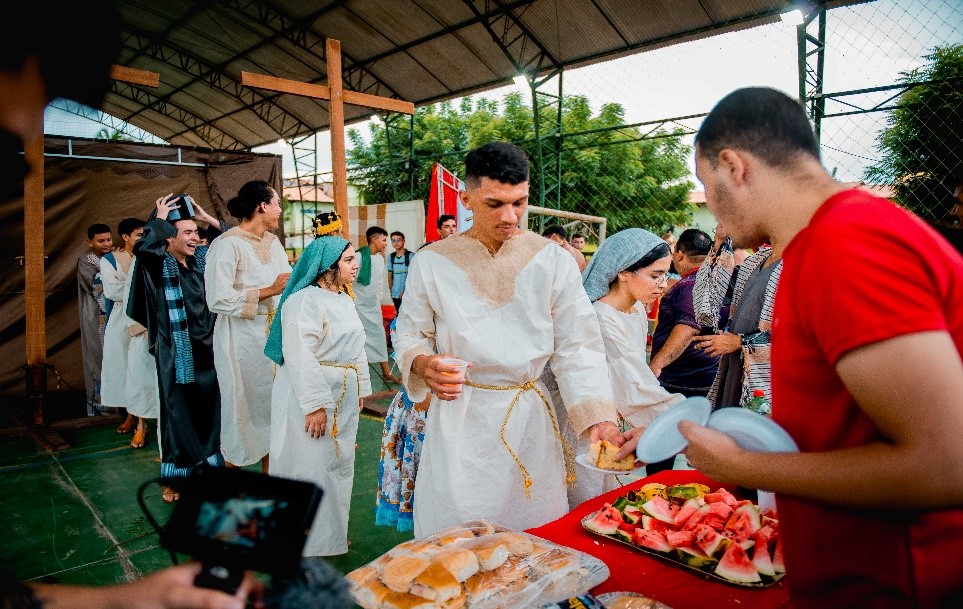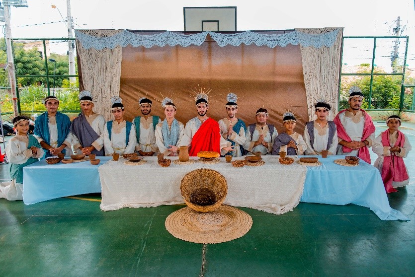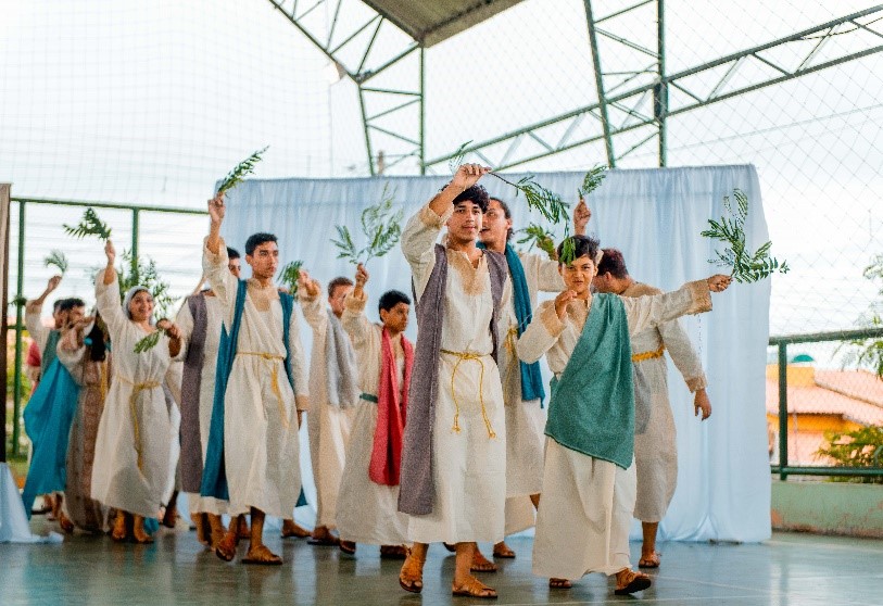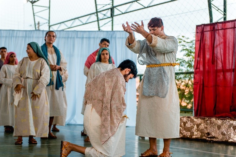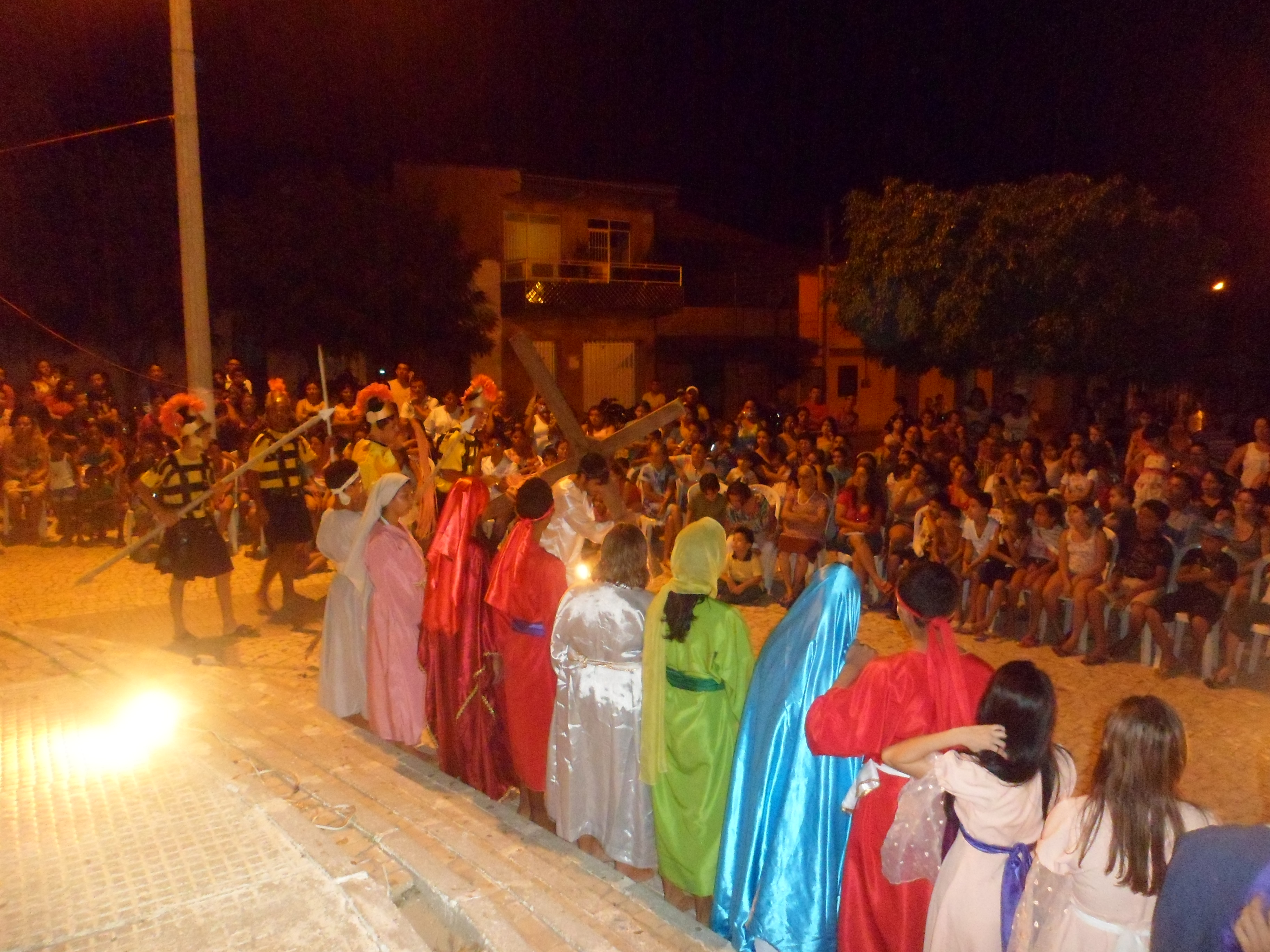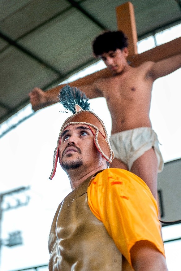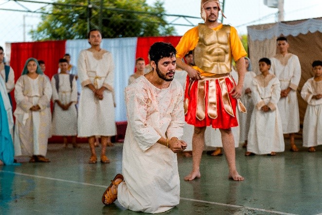 Esse diálogo de tradições resulta no espetáculo criativo na construção de suas cenas, personagens, trilha sonora, figurinos e adereços. Trabalho resultante da investigação intensiva de um grupo de artistas reunido pra promover junto a comunidade do Bairro Santa Luzia, em Canindé, mais um espaço para celebração da arte e da fé no período pascal.