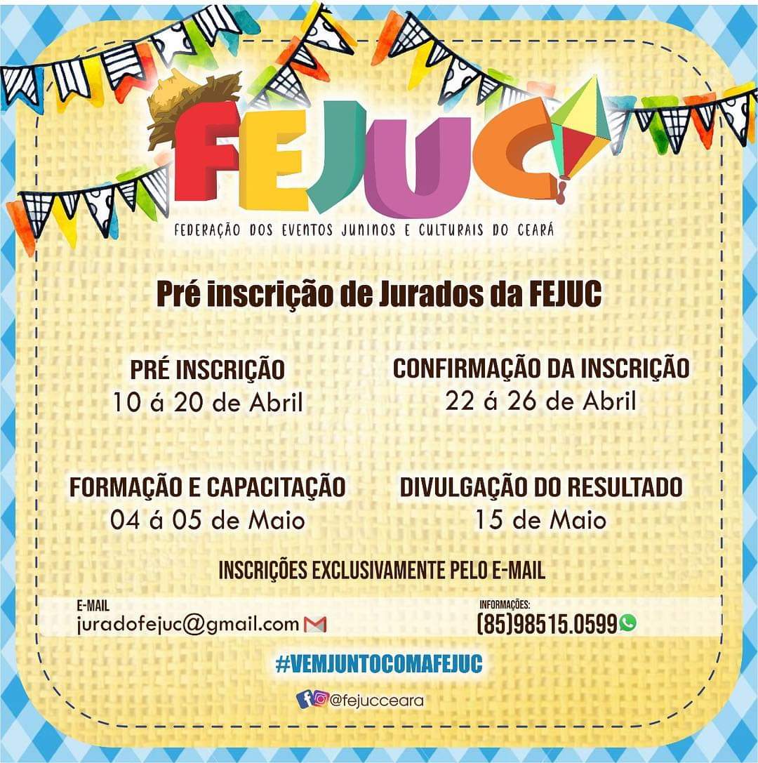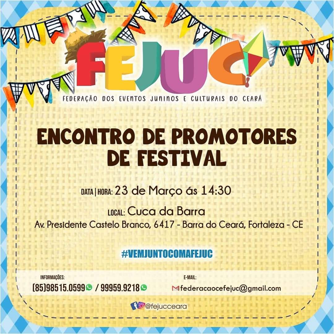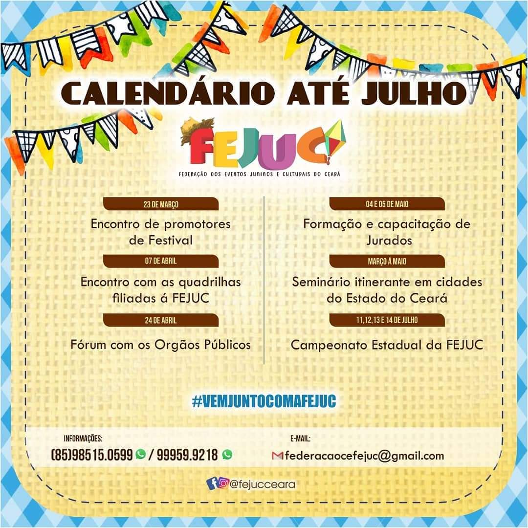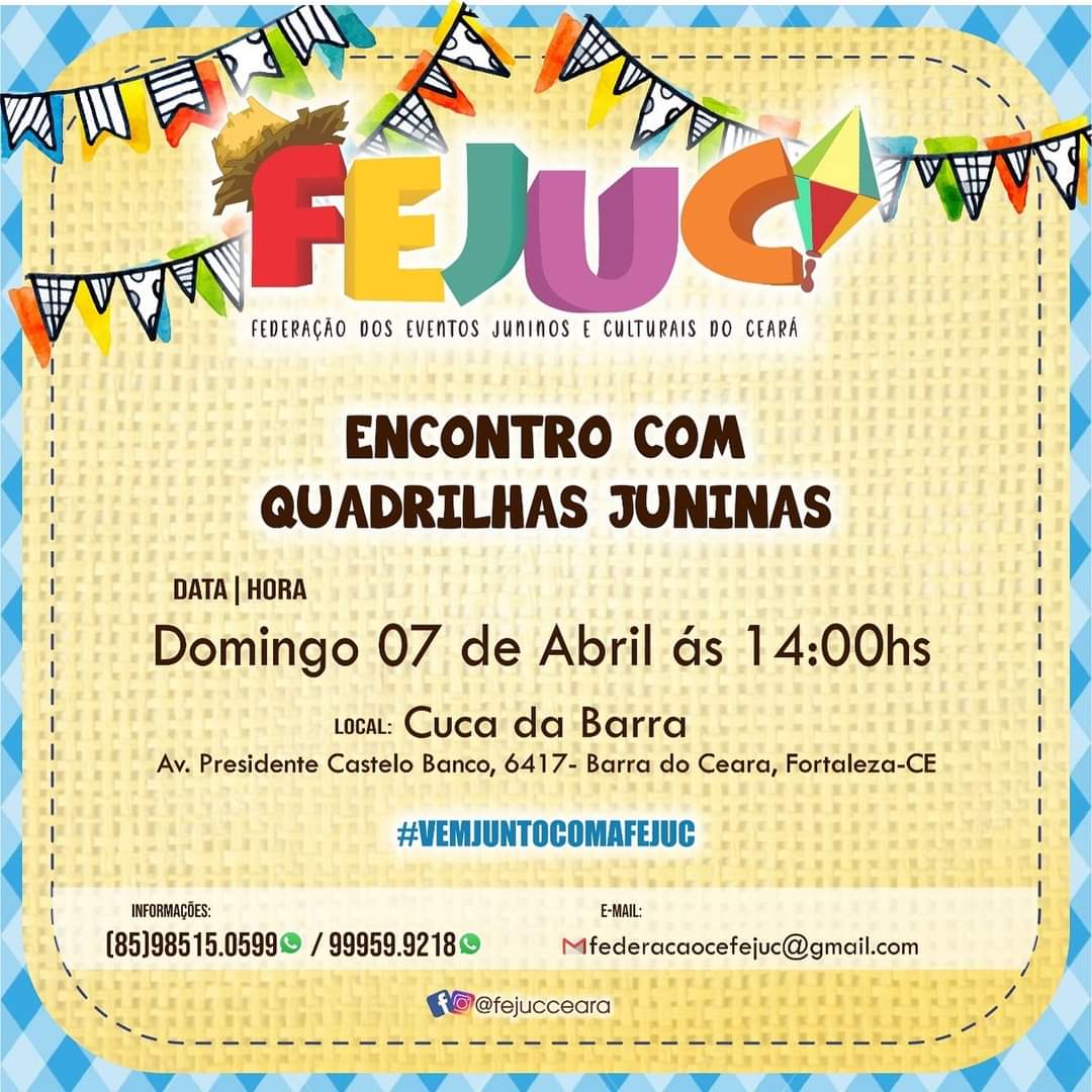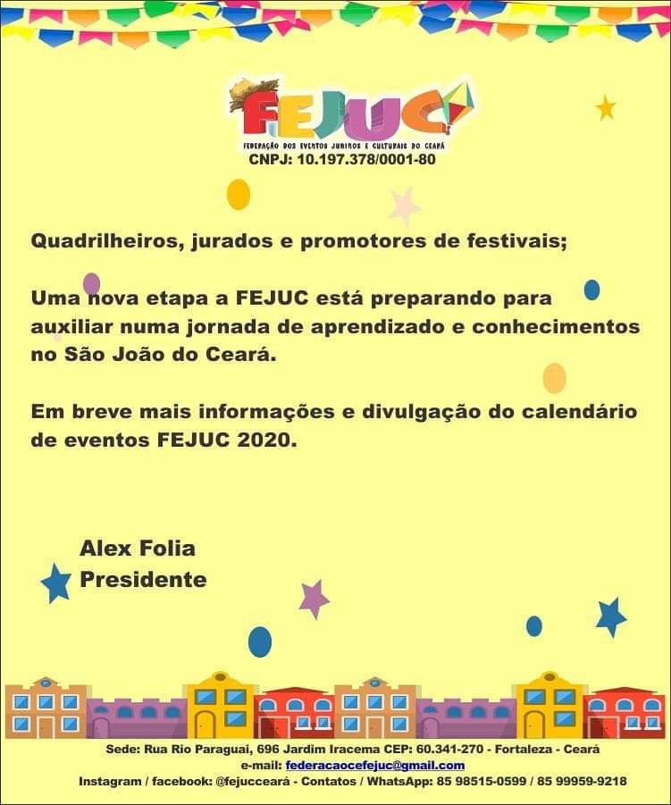 Quem Somos:A Federação dos Eventos Juninos e Culturais do Ceará - FEJUC, é uma instituição de direito privado, sem fins lucrativos, que apoia e representa promotores e organizadores de eventos juninos e culturais, quadrilhas juninas e jurados dos festejos juninos e de outras expressões artísticas, incentivando e valorizando as manifestações tradicionais populares.