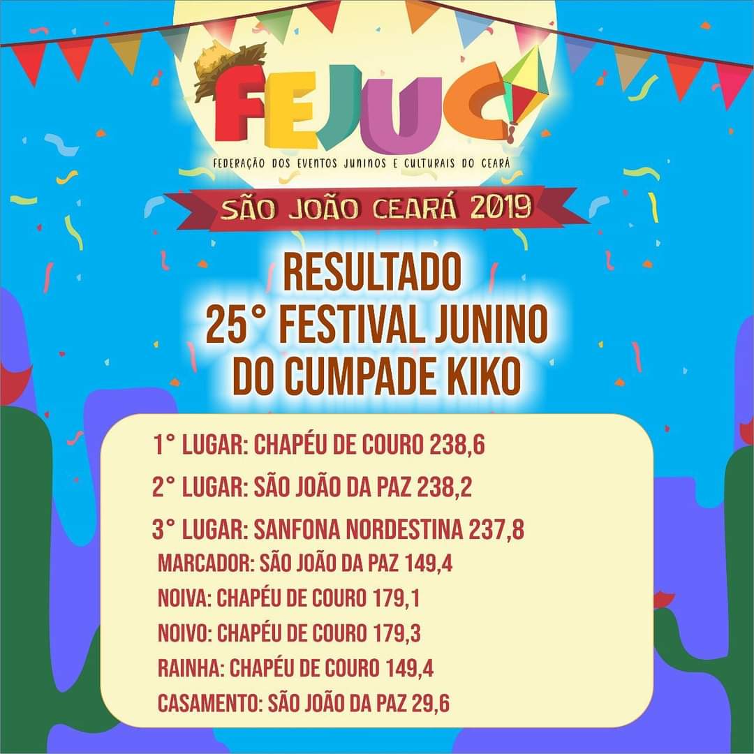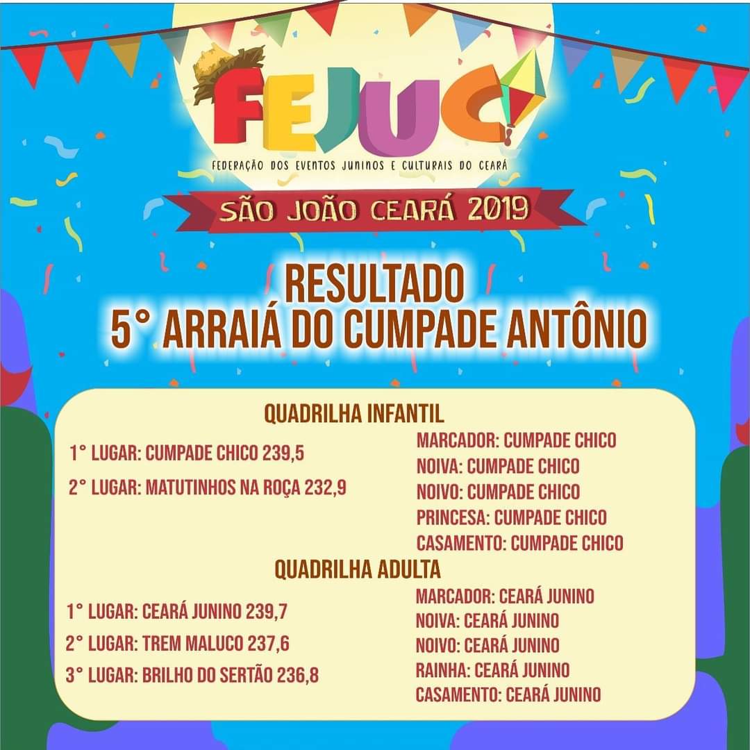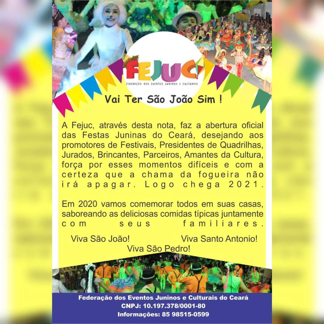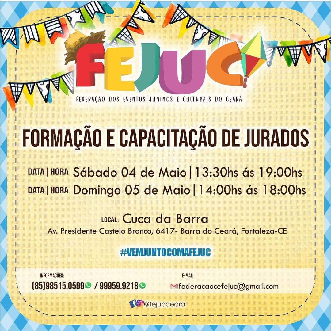 Quem Somos:A Federação dos Eventos Juninos e Culturais do Ceará - FEJUC, é uma instituição de direito privado, sem fins lucrativos, que apoia e representa promotores e organizadores de eventos juninos e culturais, quadrilhas juninas e jurados dos festejos juninos e de outras expressões artísticas, incentivando e valorizando as manifestações tradicionais populares.