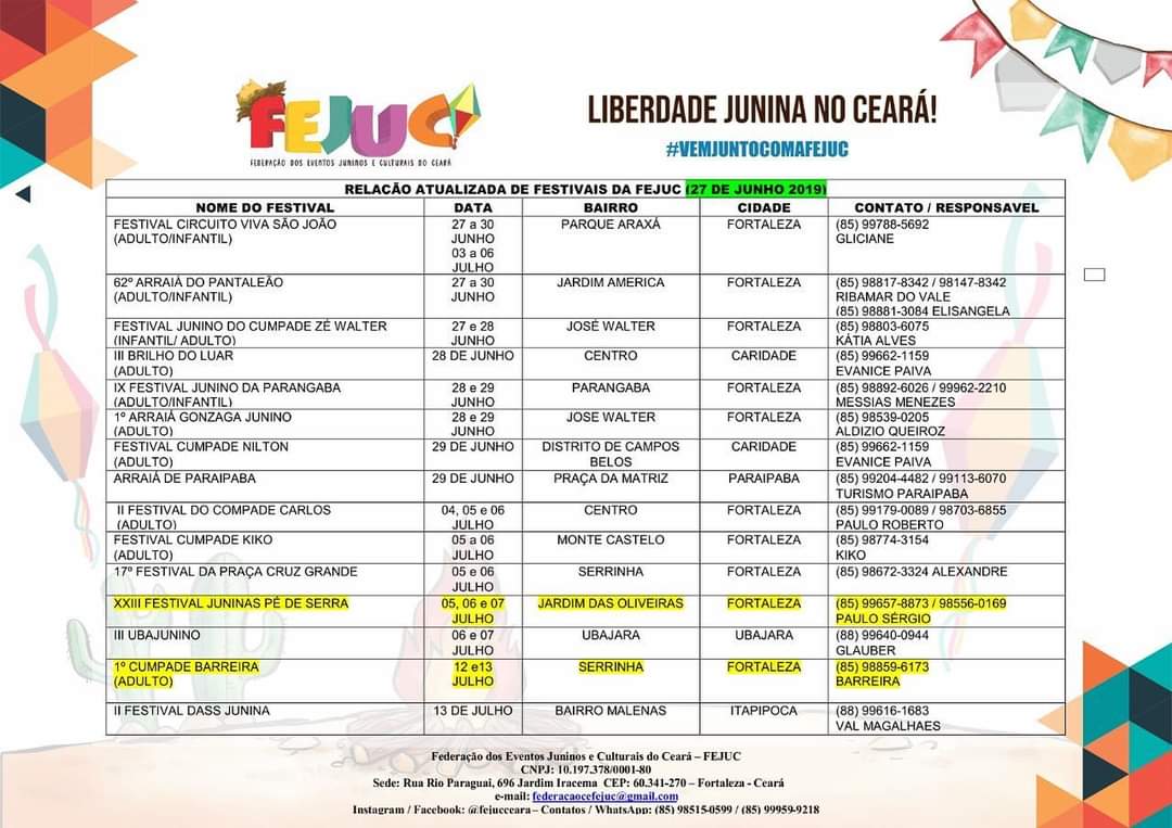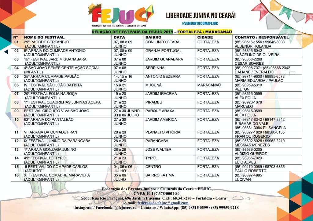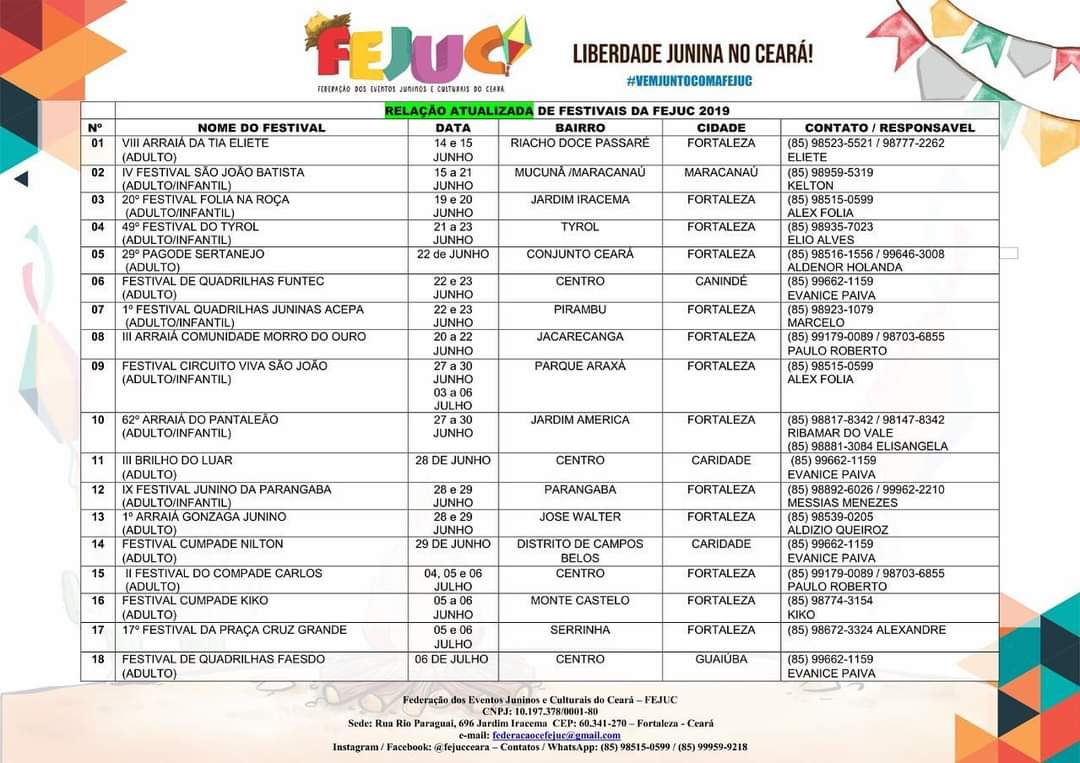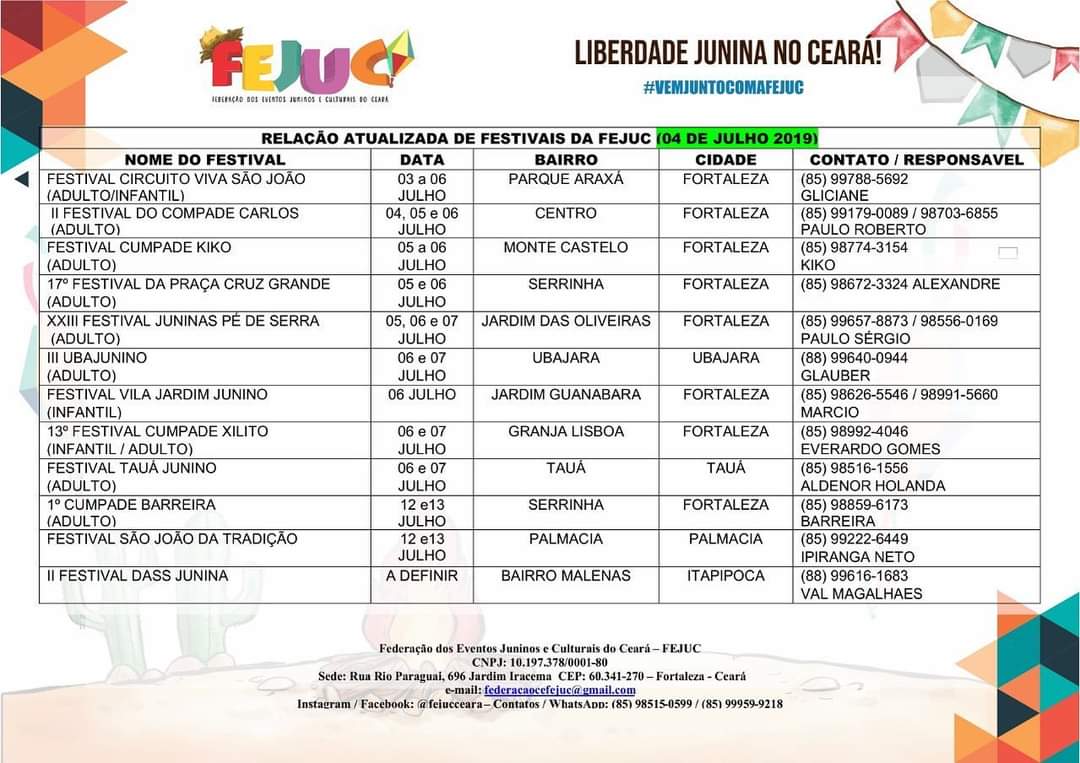 • Festivais Estaduais de Quadrilhas Juninas do Ceará;