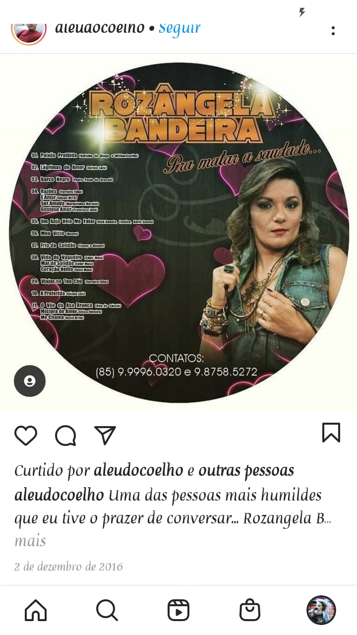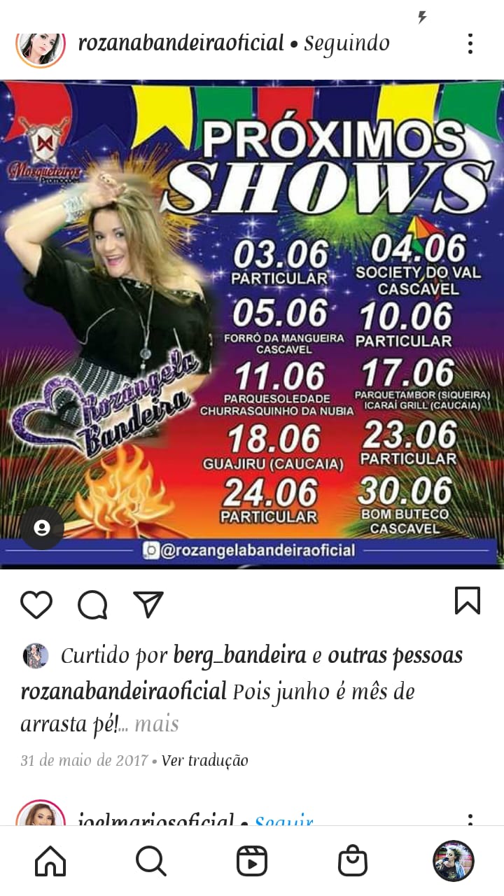 O COLETIVO ROZÂNGELA BANDEIRA E BANDA SURGIU EM 2008 DESDE QUE A VOCALISTA SAIU DA BANDA PAINEL DE CONTROLE E DECIDIU INVESTIR EM CARREIRA SOLO. COM PRODUÇÕES E APRESENTAÇÕES EM TODO TERRITÓRIO CEARENSE, COM UM REPERTÓRIO DIVERSIFICADO DE MUSICA POPULAR BRASILEIRA E REGIONAL. APRESENTANDO EM EVENTOS COORPORATIVOS, BARZINHOS, BARRACAS DE PRAIA, EVENTOS JUNINOS, FESTAS PARTICULARES, CARNAVAIS, ETC.Vídeos