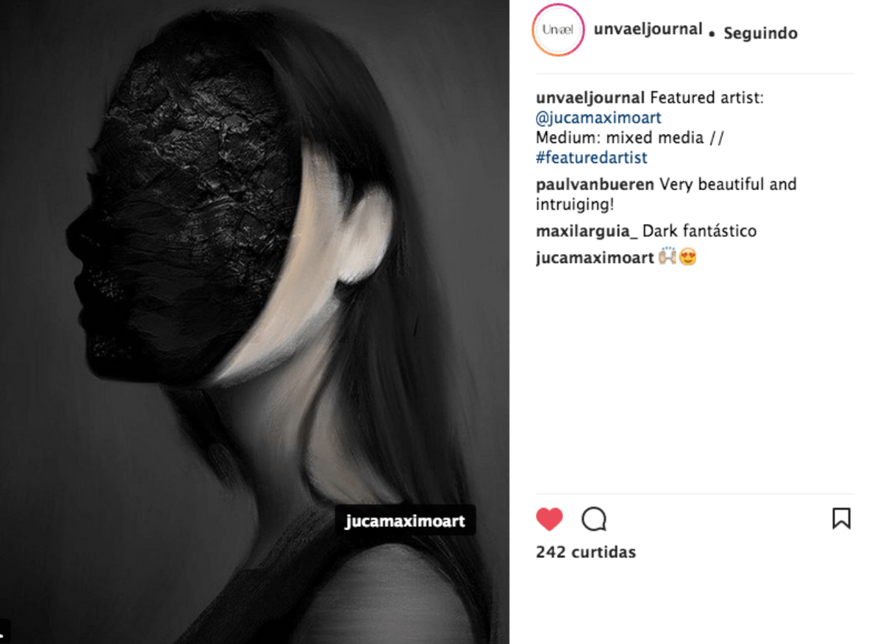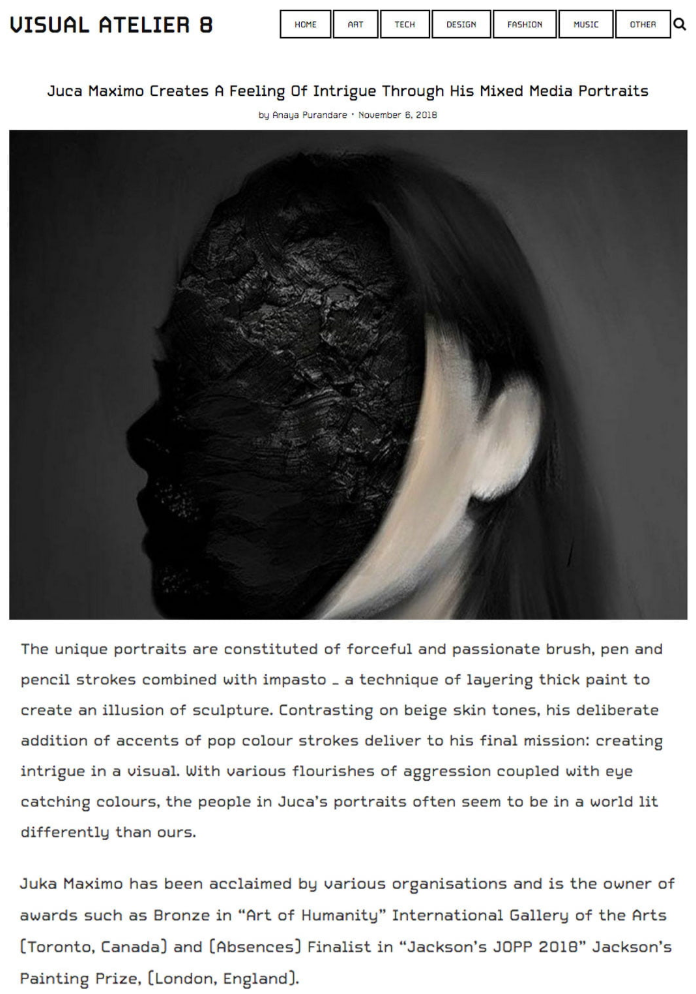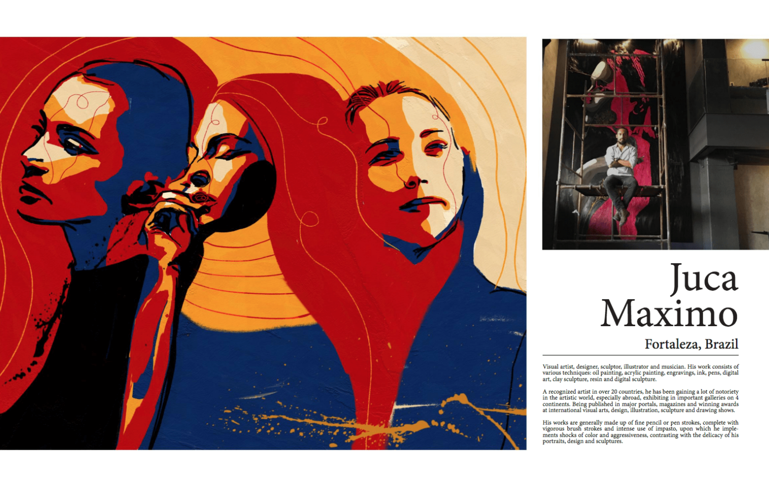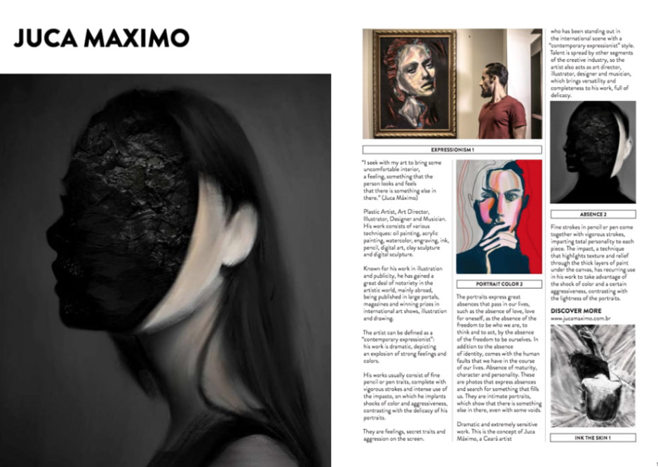 “Eu busco com minha arte trazer algum incomodo interior, um sentimento, algo que a pessoa olhe e sinta que tem algo a mais ali dentro.” (Juca Máximo)Artista Visual contemporâneo, designer, escultor, ilustrador e músico brasileiro. Considerado um dos artistas emergentes mais importantes da América do Sul pela Saatchiart, foi eleito o terceiro melhor ilustrador em 2018 pela revista Luerzer Archive, destaque no Portal Internacional Ello e premiado em vários países.