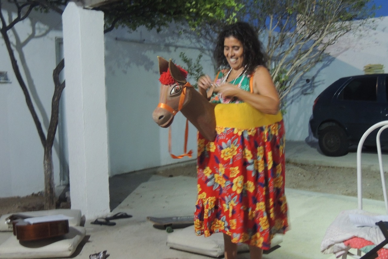 Release: A encenação consiste na apresentação de 2 contos rítmicos inspirados na cultura popular nordestina, seguidos de duas brincadeiras dançadas a serem vivenciadas junto com as crianças.