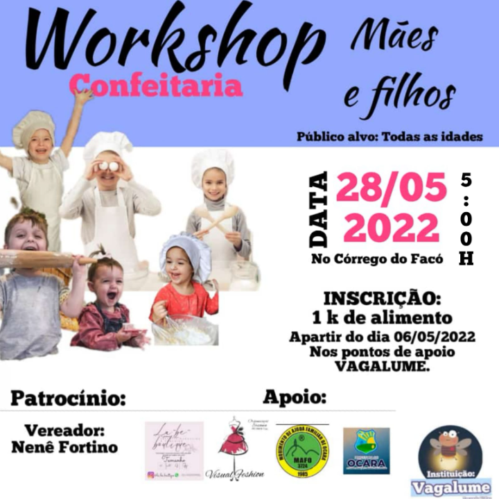Evento workshop VAGALUME Linguagens Curso ou Oficina Descrição curta A iniciativa VAGALUME promove neste sábado dia 28 de maio de 2022 uma homenagem ao mês das mães. Teremos: - Workshop: curso de confeitaria para mães e filhos - Apresentação de Battet- Dançando Arte - Brindes e Sorteios para as mães participantes. Sobre Responsáveis Classificação Etária: Livre Denunciar Contato Nome: E-mail: Tipo: Mensagem: Denúncia anônima Receber cópia da denúncia Cancelar Enviar Denúncia Enviando mensagem Nome: E-mail: Tipo: Mensagem: Mensagem anônima Enviar somente para o Responsável Receber cópia da mensagem Cancelar Enviar mensagem Enviando mensagem