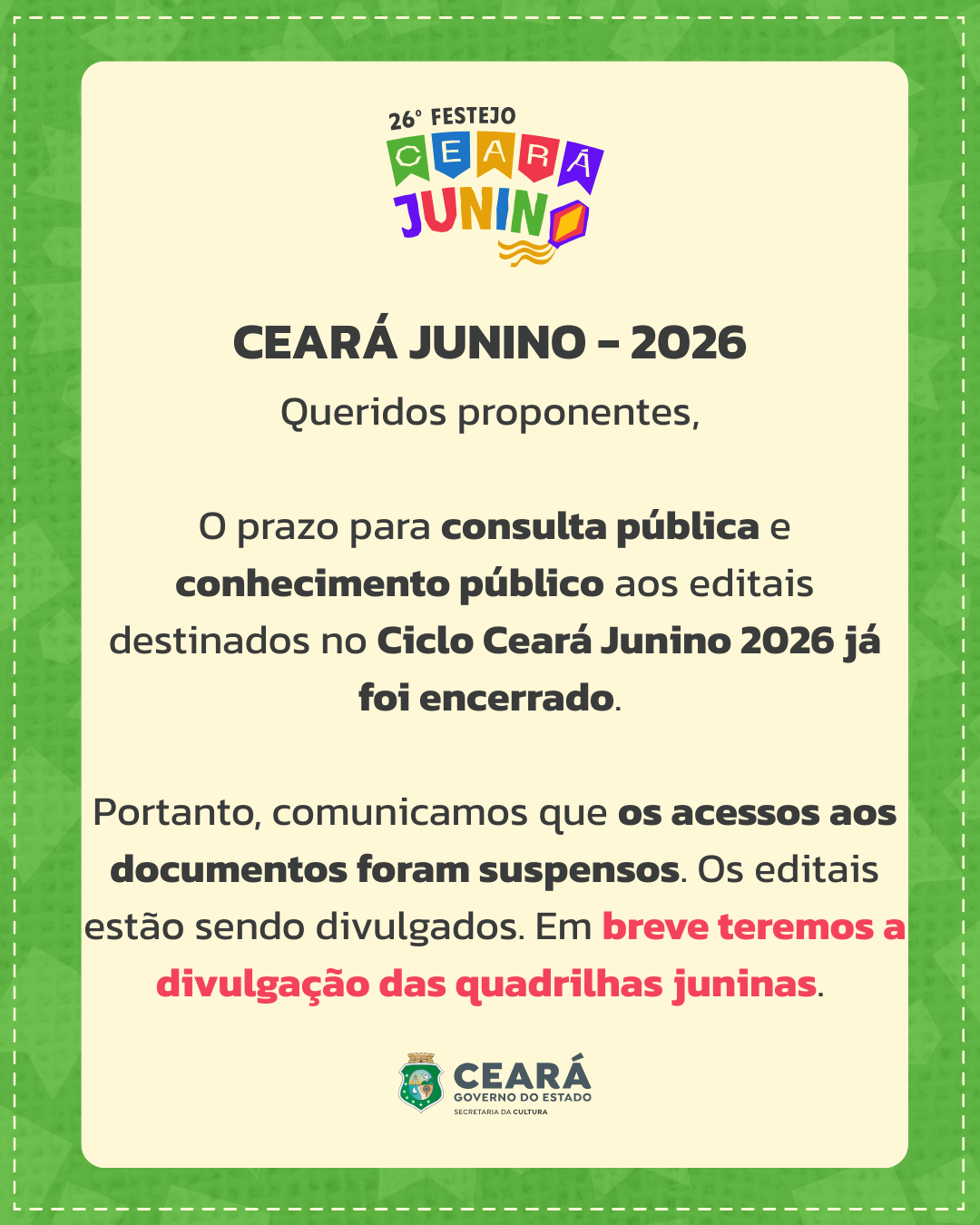 [CONSULTA PÚBLICA] - EDITAL PARA FESTIVAIS REGIONAIS DE QUADRILHAS JUNINAS - 2026