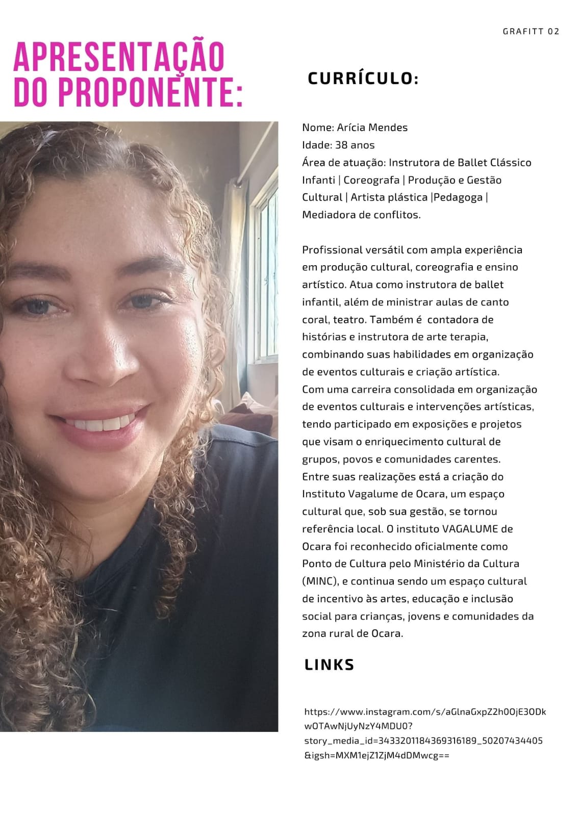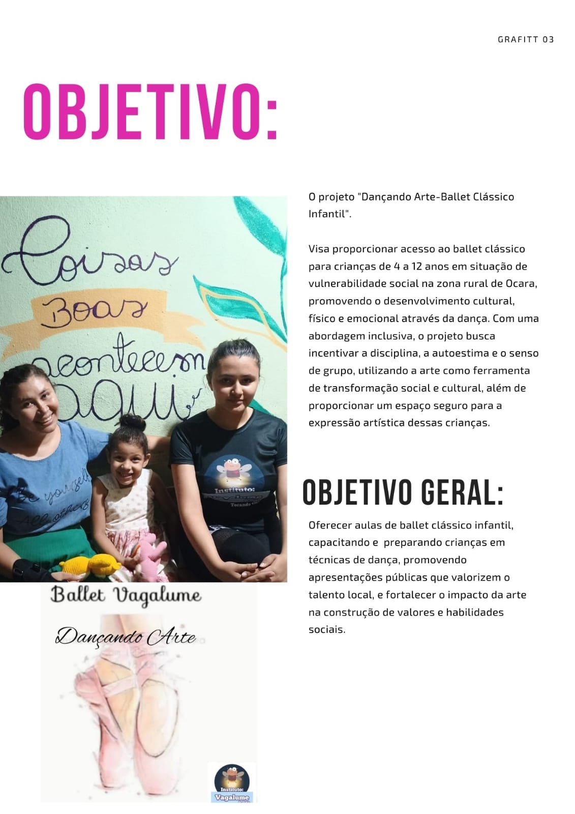 O projeto "Dançando Arte" visa proporcionar acesso ao ballet clássico para crianças de 4 a 12 anos em situação de vulnerabilidade ou risco social na zona rural de Ocara, promovendo o desenvolvimento cultural, físico e emocional através da dança. Com uma abordagem inclusiva, o projeto busca incentivar a disciplina, a autoestima e o senso de grupo, utilizando a arte como ferramenta de transformação social e cultural, além de proporcionar um espaço seguro para a expressão artística dessas crianças.Galeria
